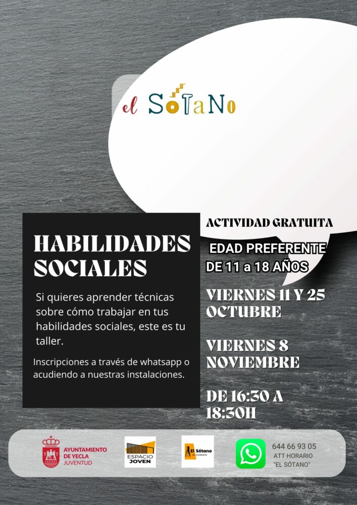 El 11 de octubre comenzará un taller de habilidades sociales y mentales, impartido por profesionales de la psicología. Este taller, que se repetirá el 25 de octubre y el 8 de noviembre, tiene como objetivo fortalecer el desarrollo personal de los jóvenes y se llevará a cabo de 16:30 a 18:30 horas.