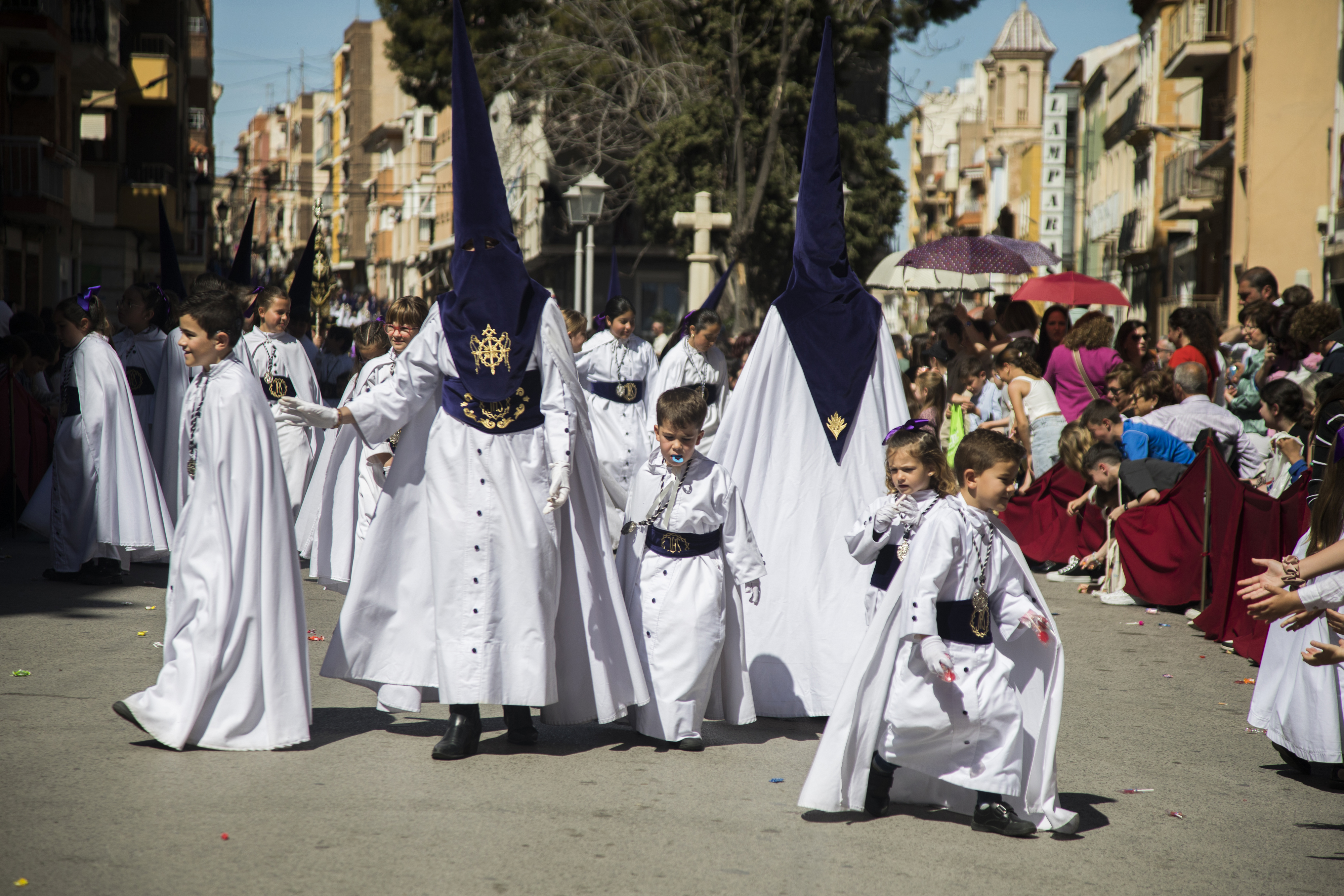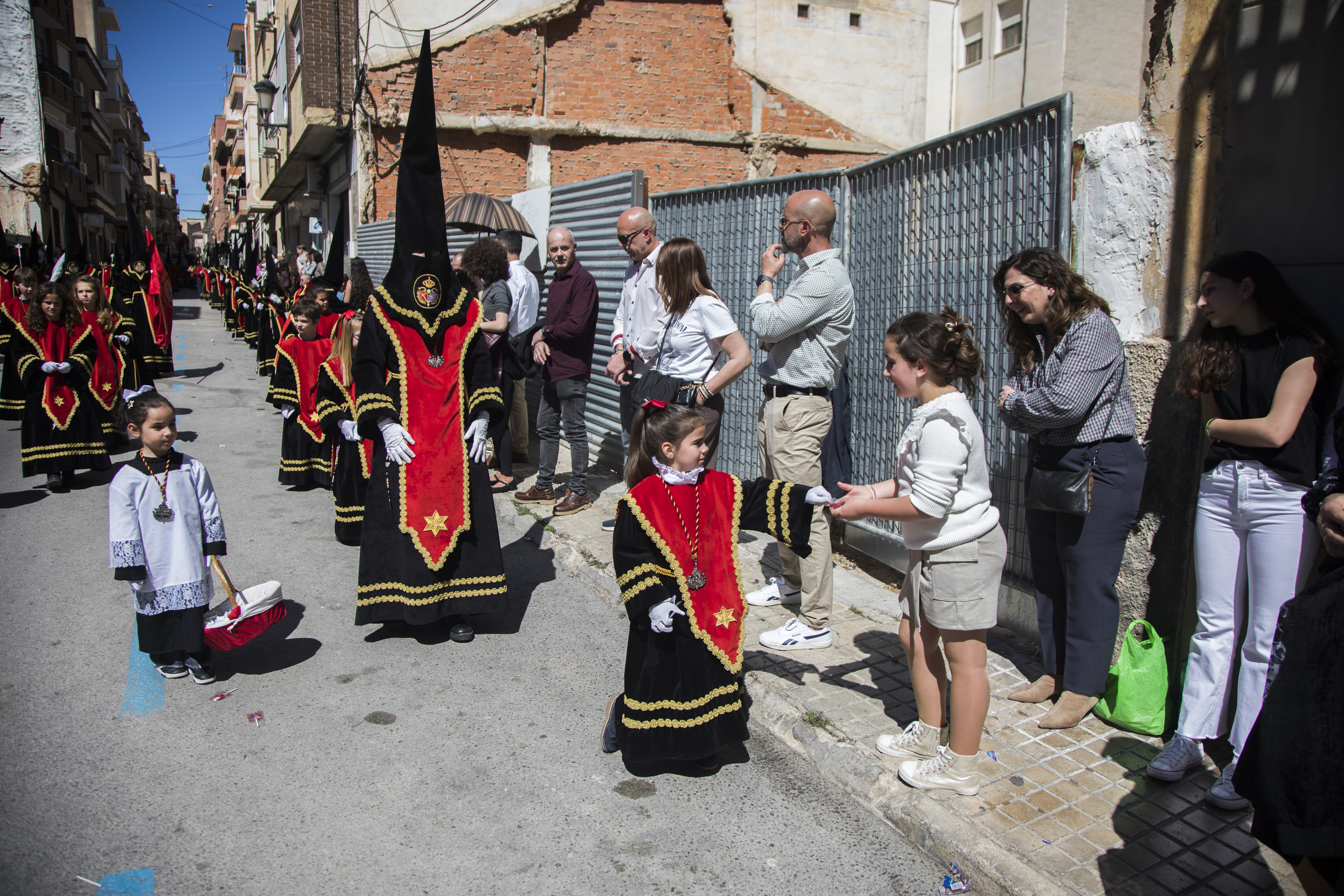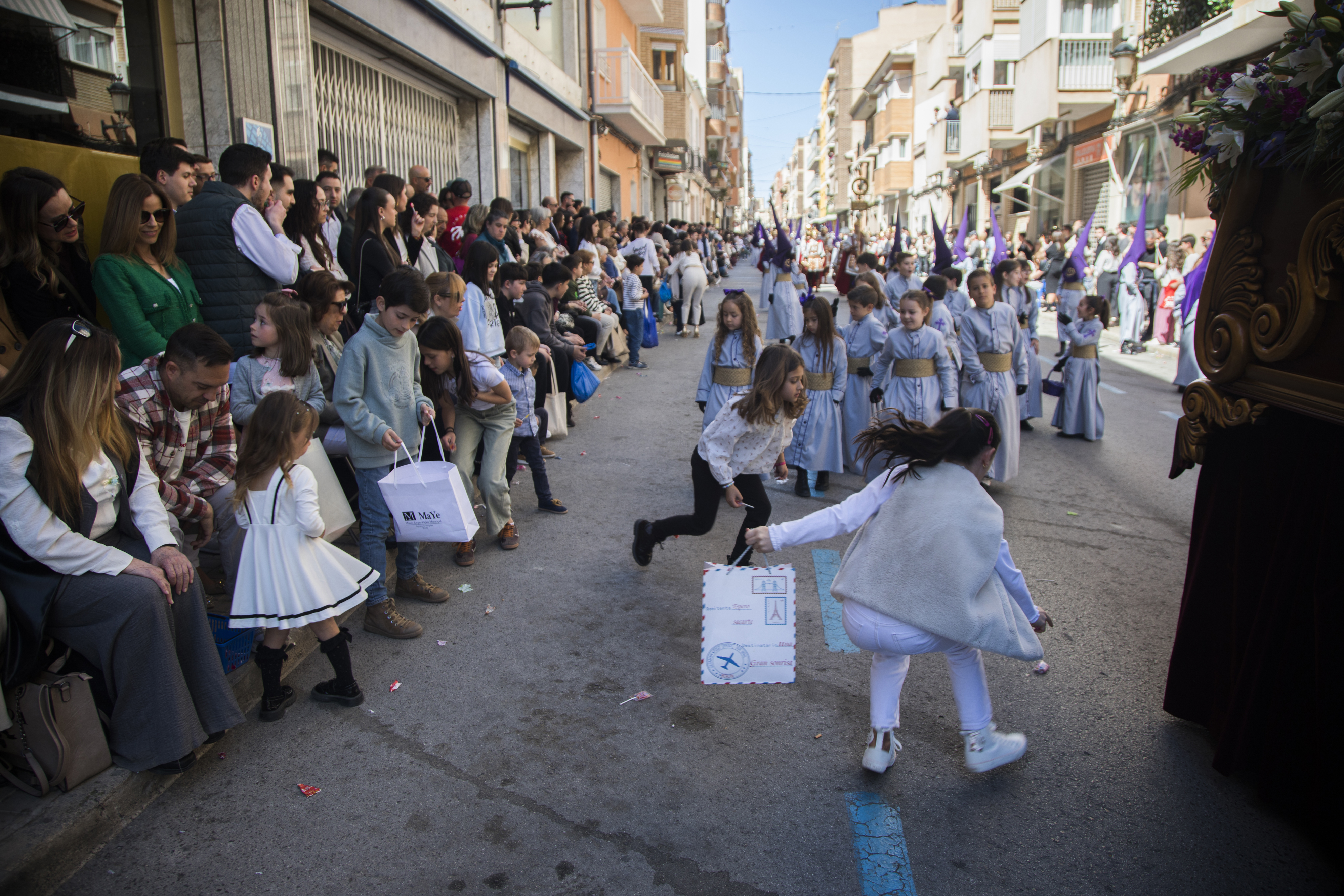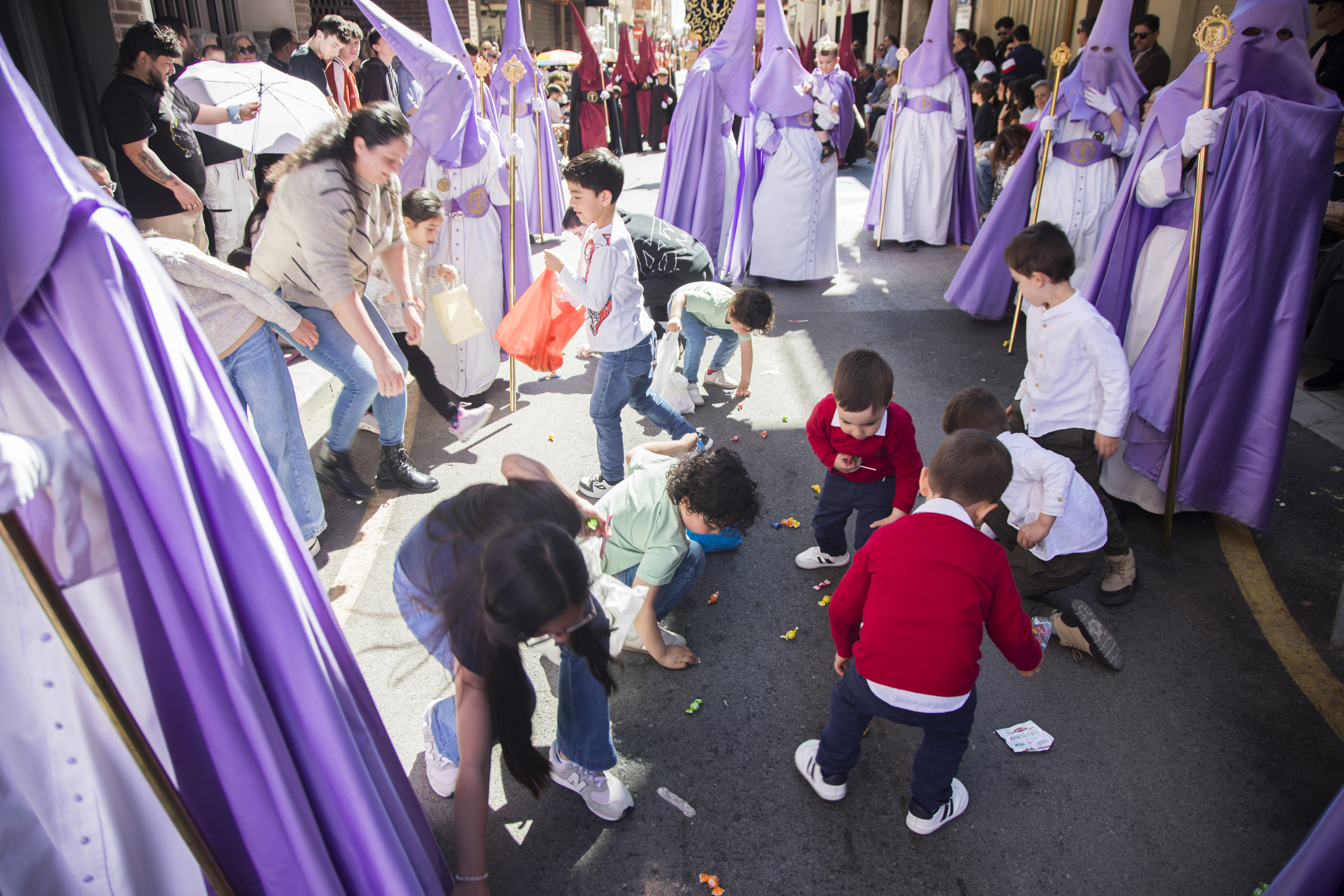 Los caramelos, la alegría y el color de la jornada llenó las calles centricas de la localidad para los vecinos que quisieron participar de la procesión más alegre de las que se desarrollan cada año. Un alegría que los pequeños viven recogiendo los cientos de kilos de caramelos que se lanzan por parte de las cofradías de la Semana Santa de Yecla.