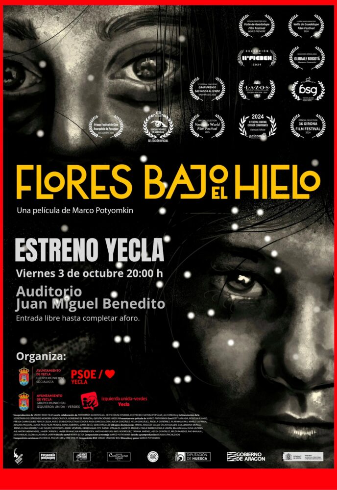 Este viernes 3 de octubre, a las 20:00 horas, el auditorio municipal Juan Miguel Benedito de Yecla acogerá la proyección del documental Flores bajo el hielo, una obra de memoria histórica centrada en el papel de las mujeres durante la Guerra Civil y la dictadura franquista. El director de la cinta, Marco Potyomkin, estará presente en el acto, organizado por PSOE e IU.