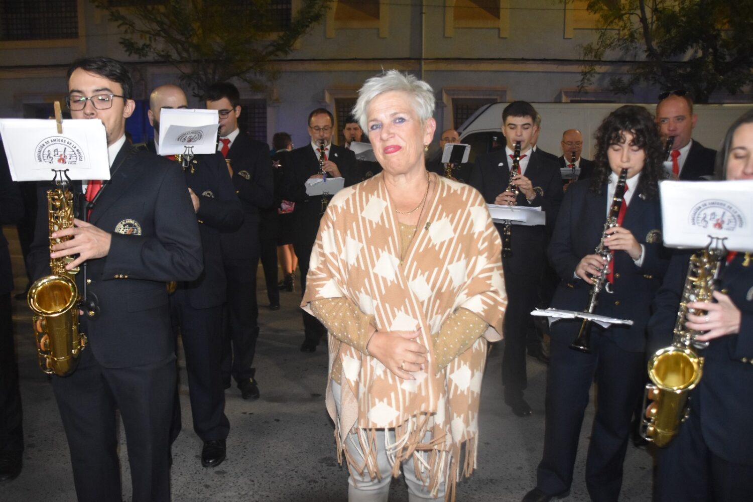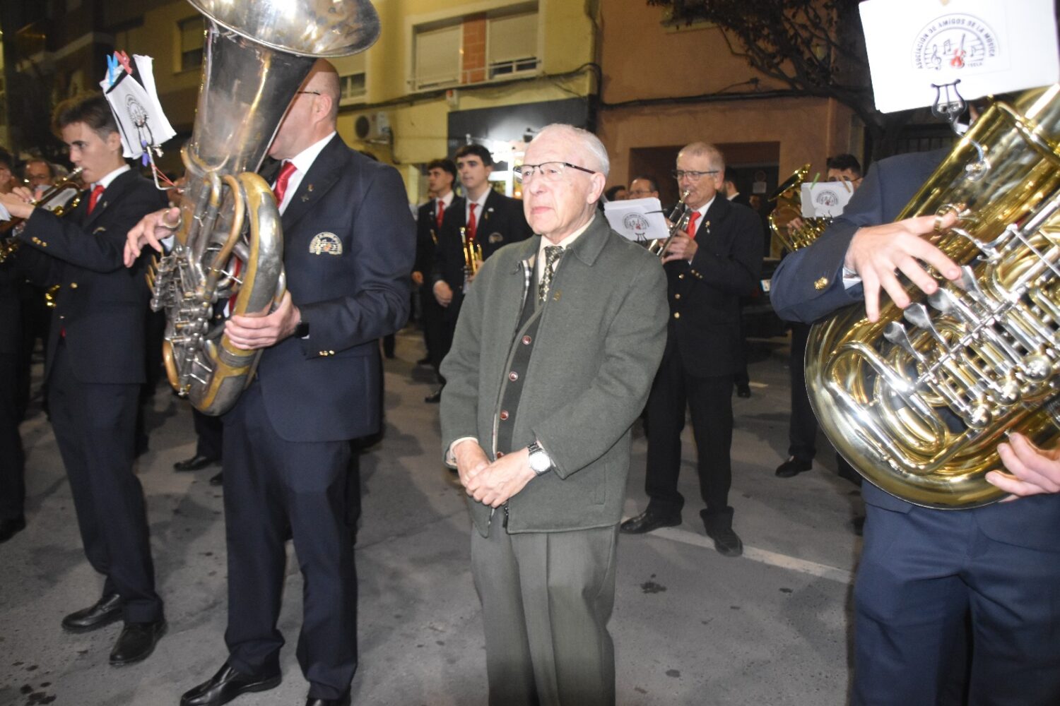 A lo largo del recorrido, la banda realizó varias paradas emotivas, destacando la realizada frente al domicilio de Ángel Hernández Castaño, antiguo clarinetista de la banda, quien, a pesar de su avanzada edad, salió al balcón abrigado con una manta para saludar a los músicos que le rindieron un pequeño homenaje.