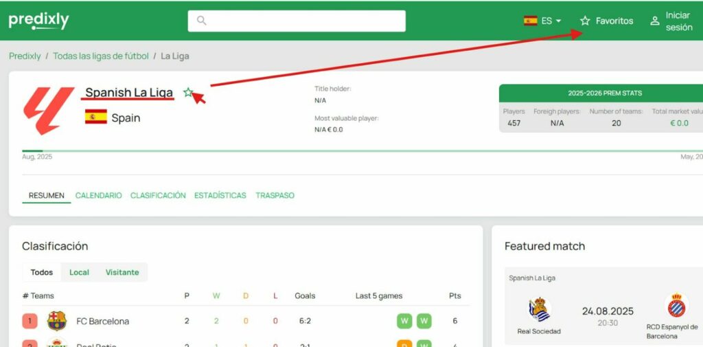 Además de resultados, Predixly ofrece calendarios interactivos y comparativas entre equipos. Así, un aficionado puede seguir la agenda de España, revisar partidos pasados o incluso guardar favoritos para no perder detalle.