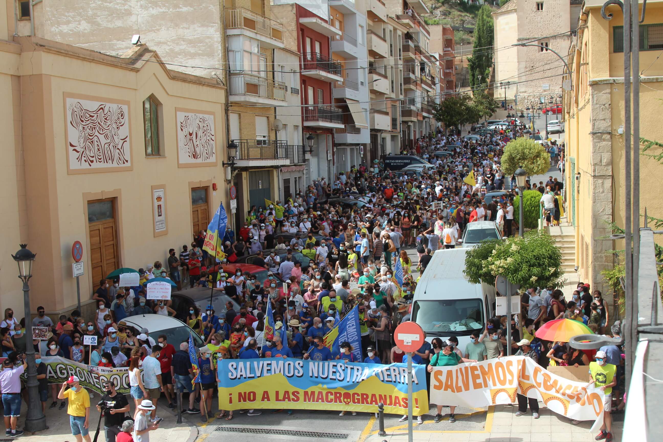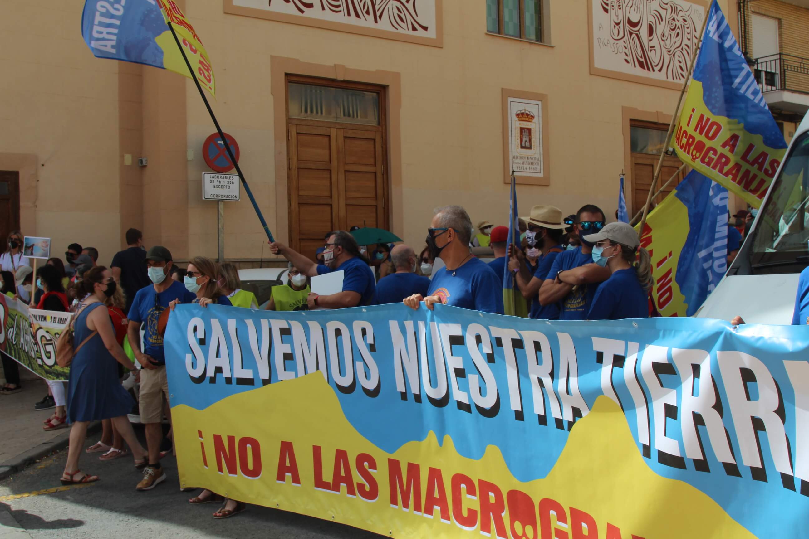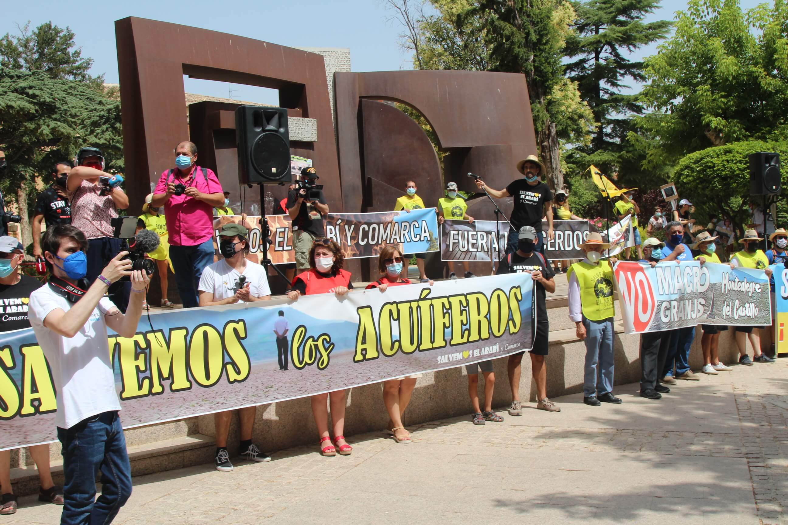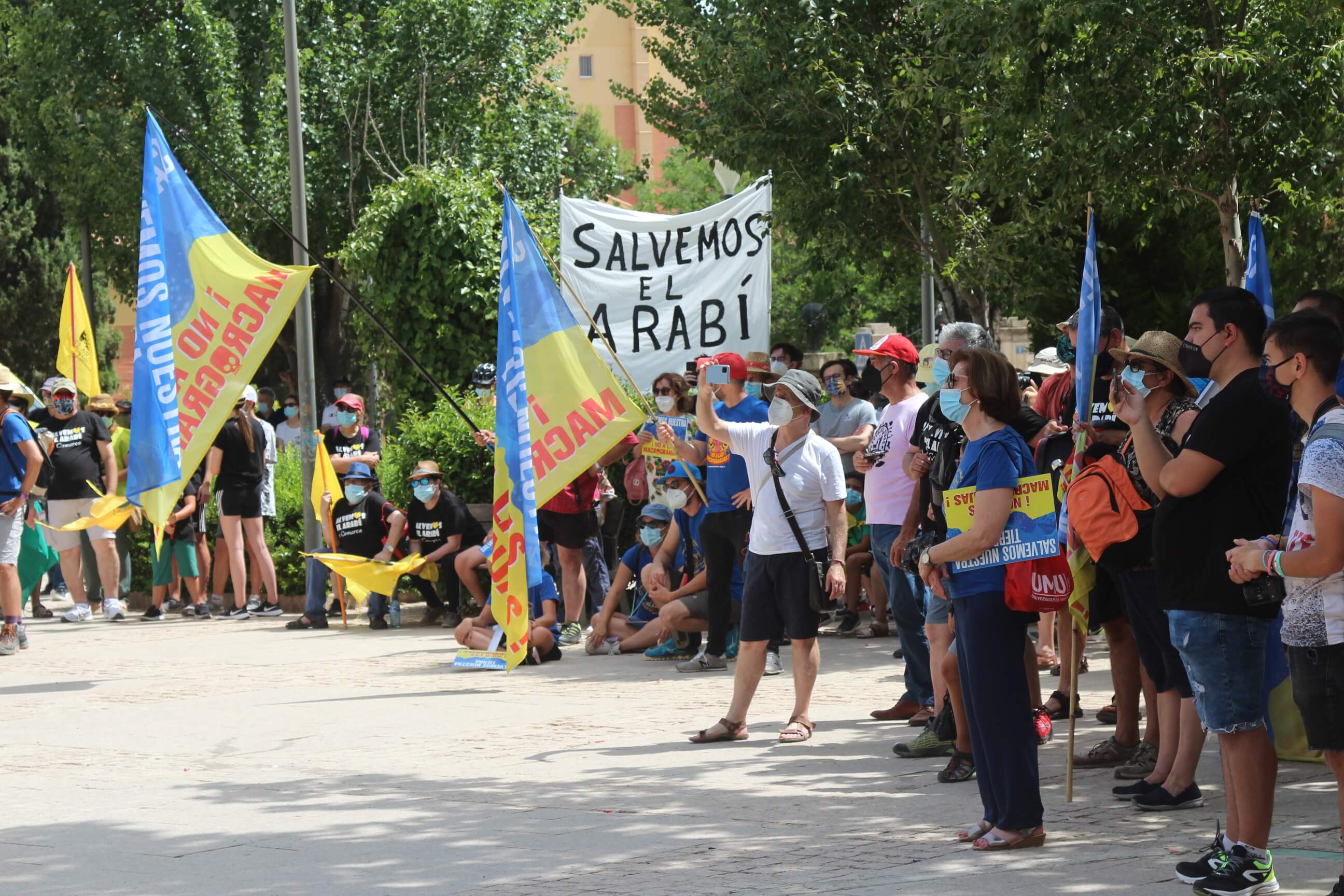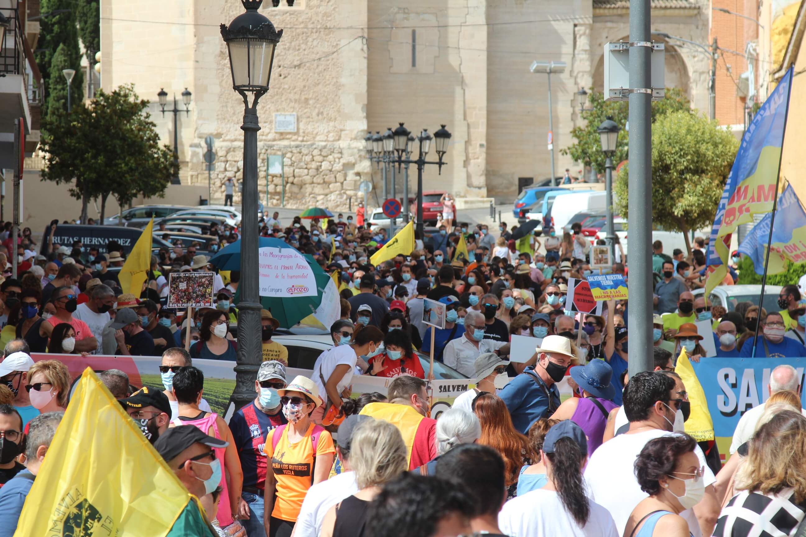 Ni el intenso calor, más de 35 grados a la sombra, ni las medidas sanitarias que obligaron a todos los asistentes a llevar puesta la mascarilla al aire libre…nada ha evitado que miles de vecinos de Yecla volvieran a salir a la calle cuatro años después para salvar el Monte Arabí.Se trata de un espacio natural, primer Monumento Natural de la Región de Murcia y declarado patrimonio de la humanidad por la UNESCO, tiene desde hace cuatro años la amenaza de la construcción de una macrogranja porcina en sus proximidades. Hace cuatro años la ciudadanía de Yecla salió a la calle para mostrar su rotunda oposición y hoy de nuevo la respuesta fue multitudinaria.La Policía Local cuantificó entre 10.000 y 12.000 las personas presentes en el acto de protesta. Los organizadores hablaron de unas 14.000, cifra semejante a la de hace cuatro años. Sea cual sea el número de personas que acudieron a la manifestación, lo cierto es que había muchas personas y que eran de todos los ámbitos sociales, diferentes ideologías, representando a entidades, organismos, asociaciones, colectivos y partidos políticos. “Estamos emocionados con la respuesta a la convocatoria”, expresó uno de los portavoces de la plataforma ciudadana, Salvemos el Arabí y Comarca, que organizó esta manifestación debido a la intención en los últimos meses de reactivar el proyecto por parte de Cefusa. Una empresa que hace cuatro años aseguró que valoraba “la oposición tanto de los grupos políticos locales de Yecla como de la plataforma creada en contra de dicho proyecto” y paralizó su continuidad. Sin embargo, en los últimos meses, y antes de que terminen los plazos legales que tiene para construirla, la firma ha reactivado los trámites ante la Confederación Hidrográfica del Segura para el uso ganadero del agua y ante el consistorio manchego de Montealegre del Castillo para obtener la licencia de obras de la construcción. “No han cumplido con su palabra”, dijo el portavoz de la plataforma, Alejandro Ortuño, en la lectura de un duro manifiesto contra la empresa y sus productos que se leyó al finalizar la marcha por las calles principales de Yecla.Además, Ortuño condenó la que considera la plataforma “la falta de ética, de escrúpulos y de responsabilidad social corporativa de la empresa al querer pasar por encima de la voluntad de todo un pueblo…si siguen adelante el conflicto va a ser constante con nosotros. No vamos a parar”, expresó recibiendo un largo aplauso de los presentes que se congregaron al final de la manifestación en el Parque de la Constitución y en las calles adyacentes.Además de los convocantes, al escenario subieron representantes de diferentes colectivos de localidades de la Región de Murcia y Castilla-La Mancha afectados por la proliferación de estas macrogranjas porcinas que relataron los daños medioambientales que generan, entre otros la contaminación de los acuíferos de los que se abastecen las poblaciones.Allí se escucharon críticas a las administraciones públicas por no proteger espacios de un valor incalculable como el Monte Arabí de proyectos empresariales como el que les reunió en la protesta. Después la de marcha pacífica por las calles céntricas de Yecla y de la lectura del manifiesto en varias intervenciones, dos horas después los miles de personas presentes en la manifestación se dispersaron con la sensación generalizada de que los vecinos de Yecla vuelven a estar movilizados para defender el Monte Arabí, todo un símbolo para la localidad.